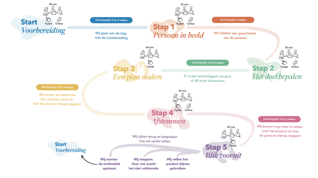 In stap 1 (zie ook afbeelding) wordt de persoon met EMB zo precies mogelijk beschreven, inclusief zijn of haar netwerk, interesses en behoeften. Daarna wordt in stap 2 op basis van vragen en schema’s het doel bepaald.