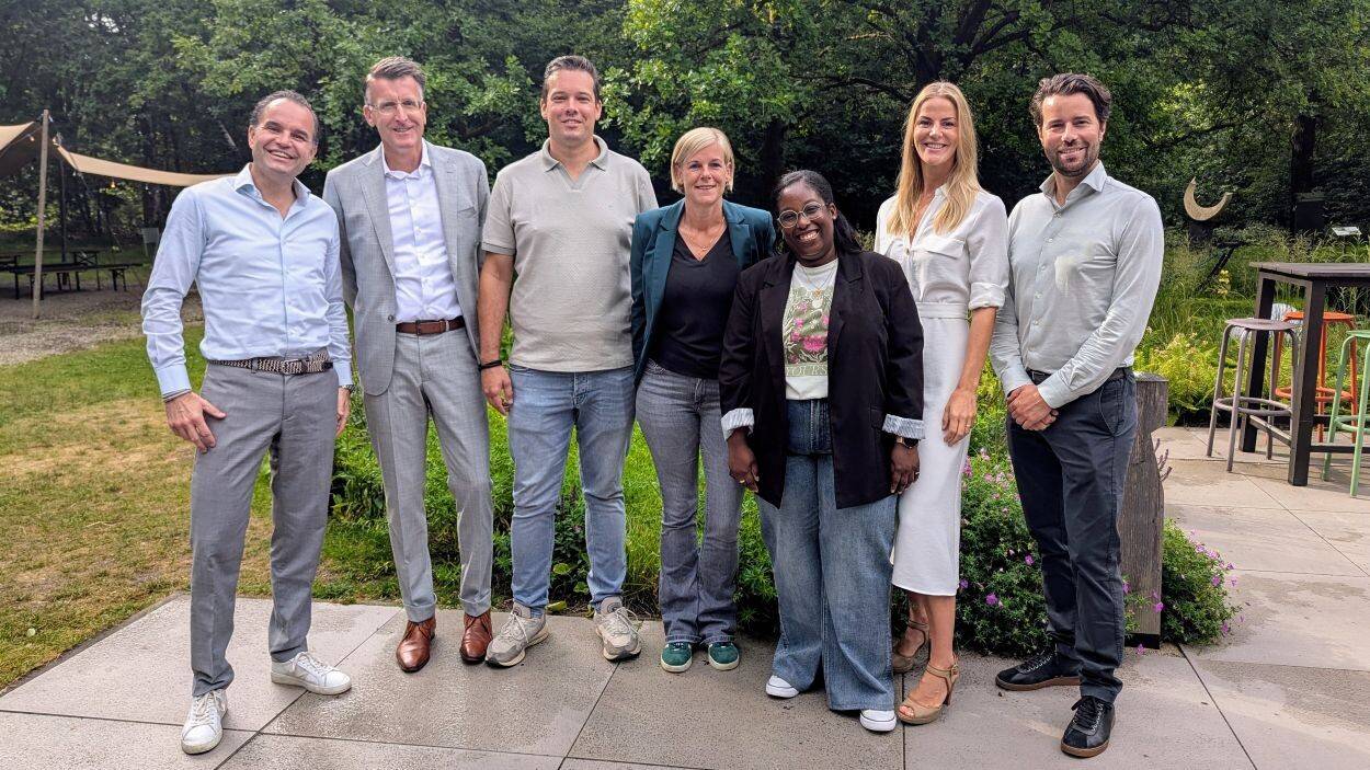 Vlnr: Siebren van der Kooij, directeur Zorg bij jou; Godfried Bogaerts, algemeen directeur BeterDichtbij; Stan de Kleijn, thuismonitoringsverpleegkundige Zorg bij jou; Margo Hulzink, teamleider medisch servicecentrum Zorg bij jou; Eva Alexander, thuismonitoringsverpleegkundige Zorg bij jou; Leonore van Kasteel, projectmanager en consultant BeterDichtbij; Pieter de Bey, directeur Santeon en Zorg bij jou.