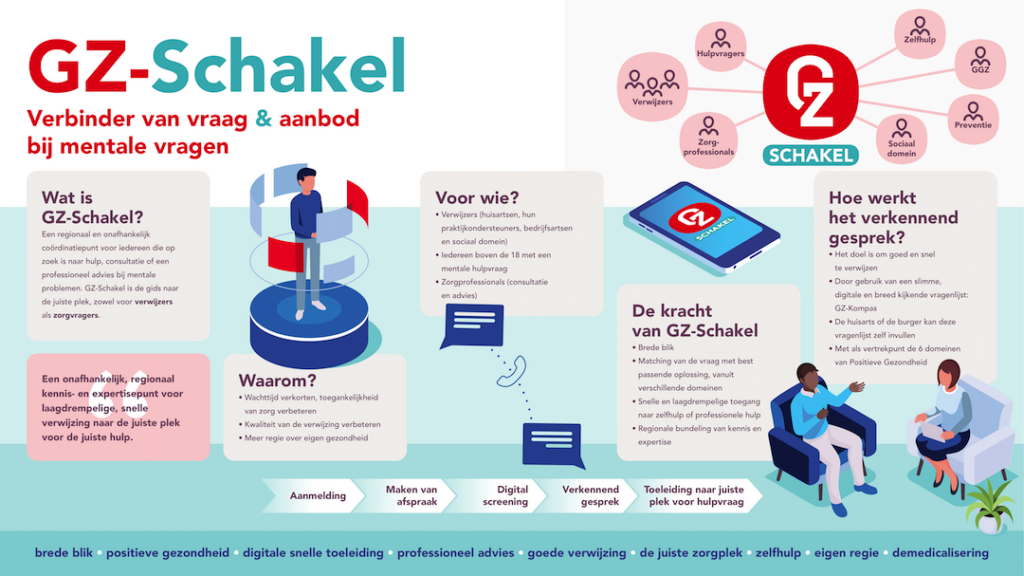 Hieronder kun je zien hoe GZ-Kompas deel uit maakt van GZ-Schakel, het centrale aanmeld- en consultatiepunt voor verwijzers, cliënten en professionals, een nieuwe dienst die GZ-Punt ontwikkelt.