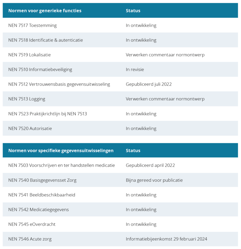 Een ander evenement is het Webinar Generieke Functies dat op donderdag 21 maart aanstaande van 10.00 tot 12.00 uur wordt gehouden. NEN organiseert dit webinar samen met het ministerie van VWS. Daarnaast is er een online informatiebijeenkomst op donderdag 29 februari voor een nieuw normontwikkelingstraject, de norm voor de specifieke gegevensuitwisseling acute zorg, oftewel een norm om eisen vast te leggen over het uitwisselen van gegevens ten behoeve van acute zorg. Tijdens de bijeenkomst komt, naast de opdracht van VWS, de verwachte planning en de mogelijkheden tot participeren in de werkgroep aan de orde. Aan de deelname zijn geen kosten verbonden.