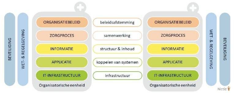 Het lagenmodel van Nictiz: alles dat informatie-uitwisseling in een zorgorganisatie raakt, is onderdeel (van de stappenplannen) in Amigo!: organisatiebeleid, zorgprocessen, informatie, applicatie en de IT-infrastructuur.