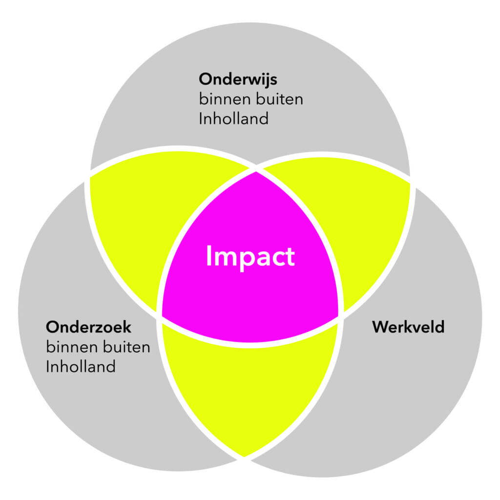 Door samenwerking te zoeken in de driehoek onderwijs, onderzoek en werkveld kan de impact van het praktijkgerichte onderzoek vergroot worden: het leidt tot verbeteringen in het werkveld, de student professionaliseert zich, het levert nieuwe kennis op waarmee een bijdrage geleverd wordt aan maatschappelijke vraagstukken en het onderwijs blijft actueel met de meest recente ontwikkelingen. De afgelopen jaren zijn binnen de Hogeschool Inholland succesvolle stappen gezet door de opzet van living labs, leergemeenschappen, kenniswerkplaatsen en ‘centers of expertise’ waar momenteel vooral bachelor studenten in participeren.