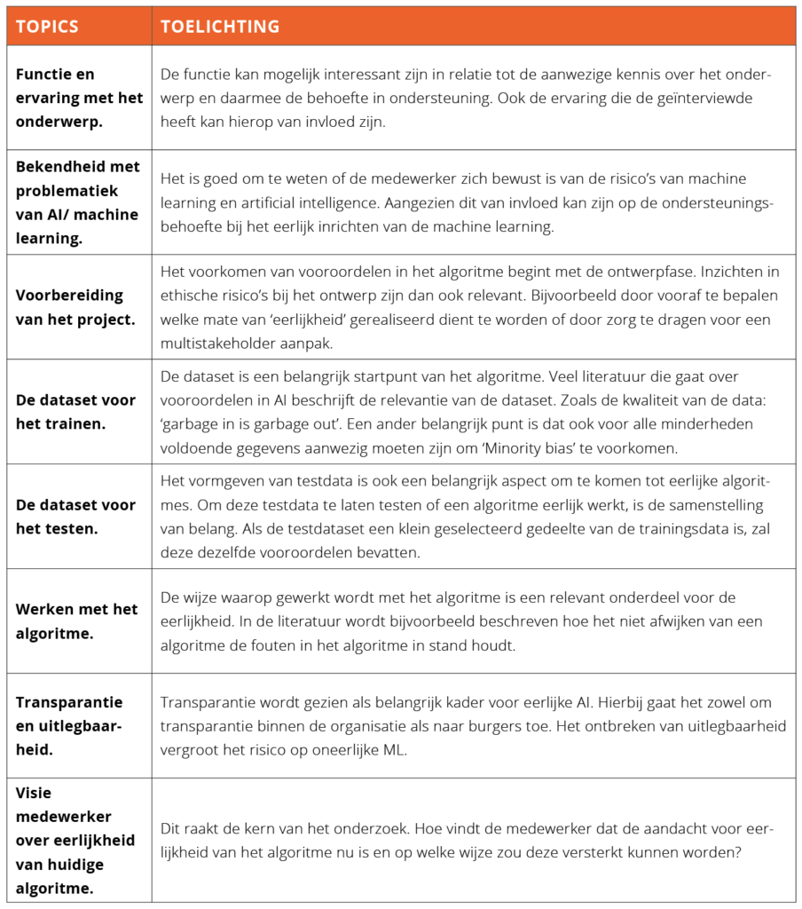 Middels een verkennend literatuuronderzoek om inzicht te krijgen in ethiek, vooroordelen en oneerlijkheid die gepaard kunnen gaan met AI, is een reeks interviewonderwerpen geïdentificeerd. Op basis van de relevante onderwerpen is vervolgens een interviewprotocol opgesteld. De onderzoekspopulatie bestond uit huidige en voormalige werknemers die betrokken zijn of zijn geweest bij het verkennen van de mogelijkheden voor ML. Dit werd gedaan om een basiskennis van het onderwerp te verzekeren. Via semigestructureerde interviews is de data verzameld.