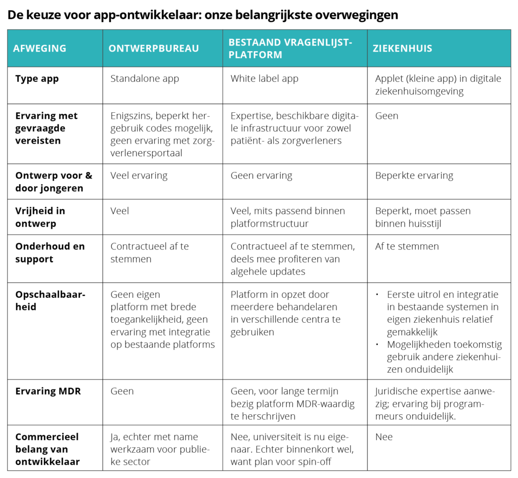 De keuze voor de app-ontwikkelaar heeft zowel invloed op korte termijn (denk aan creatieve mogelijkheden en ervaring), als op de middellange termijn (zoals updates en implementatie) en de lange termijn (bijvoorbeeld ervaring met MDR). We ontdekten dat er niet één ideale partij bestaat waarbij een kindvriendelijk ontwerp, duurzame inzetbaarheid en opschaalbaarheid van de PROfeel 2.0-app samenkomen (zie tabel). Daarom besloten we de sterke punten van onze gesprekspartners te combineren. Dit kan complex zijn, maar heeft wel het potentieel om synergetisch te werken.