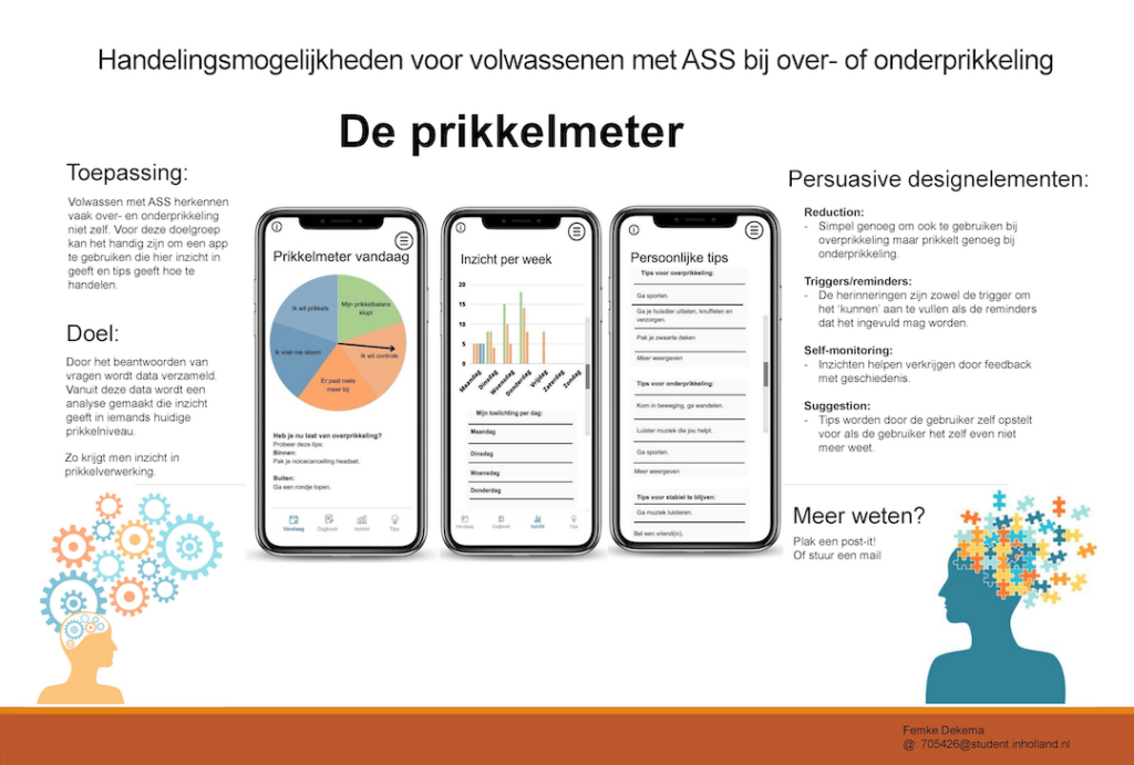 In de app staan tips voor overprikkeling en onderprikkeling en tips om stabiel te blijven. De gebruiker kan deze tips zelf invullen zodat ze op de persoon zijn afgestemd. Daarnaast bevat de app vragenlijsten om in kaart te brengen hoe iemand zich voelt (selfmonitoring). Dit leidt tot het herkennen van patronen, die in een begeleidingsgesprek besproken kunnen worden. Deze persuasive designelementen moedigen de gebruiker aan om de app te gebruiken en ondersteunen bij het veranderen van het gedrag.