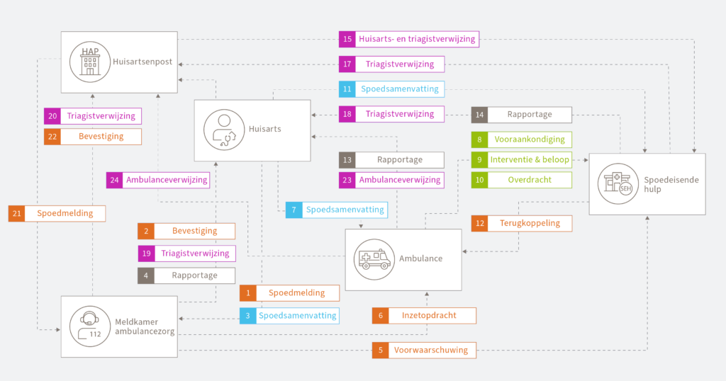 In totaal gaat het om 23 berichten die de informatievoorziening tussen de huisartsenpost, huisarts, spoedeisende hulp, meldkamer en ambulance ondersteunen (zie illustratie rechts). Door toedoen van de informatiestandaard dragen alle acute zorgverleners via hun eigen computersysteem, op voor iedereen begrijpelijke manier, informatie aan elkaar over.