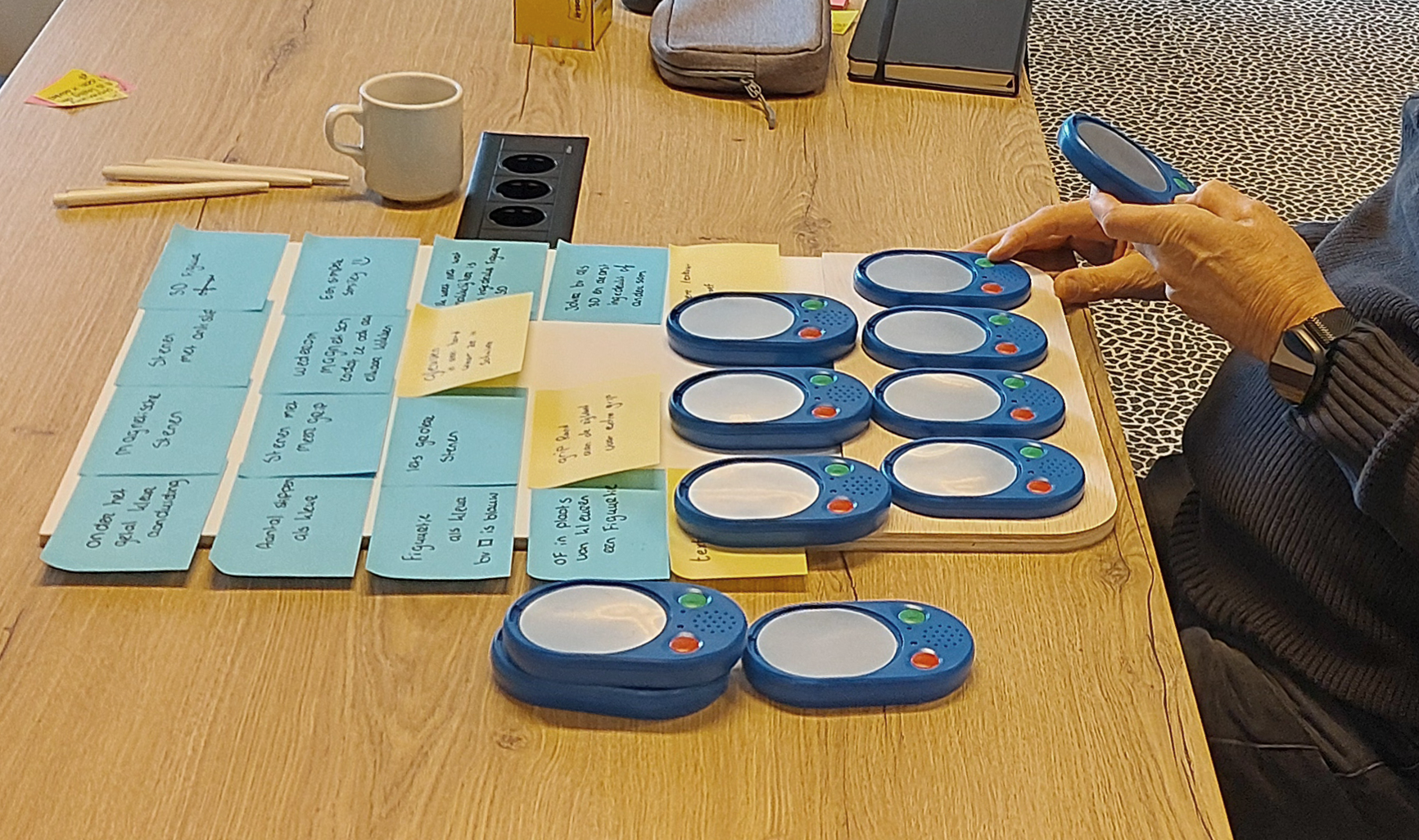 Binnen dit project hebben we de co-design sessie specifiek multisensorisch vormgegeven. We wilden dat elke deelnemer op zijn eigen voorkeursmanier ideeën kon inbrengen. Deelnemers met zicht konden zo de standaardoplossingen (post-its, tekenen) gebruiken. Deelnemers zonder zicht boden we auditieve en tactiele mogelijkheden voor hun inbreng. Ons doel was dus niet om visuele elementen volledig te schrappen, maar te versterken én aan te vullen met alternatieven die geschikt zijn voor mensen met een visuele beperking.