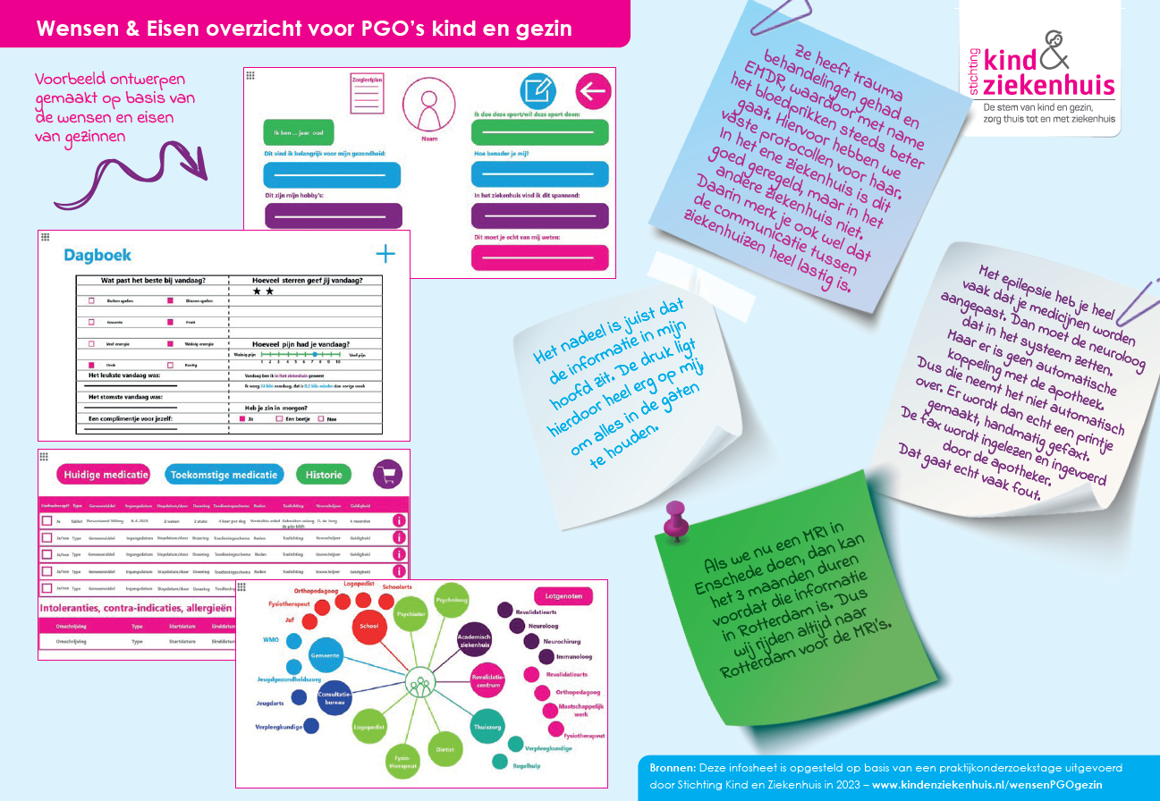 “Een kind is meer dan een medisch dossier,” vervolgt Rippen-Wagner. Ouders hebben behoefte aan een platform dat niet alleen meer inzicht en overzicht biedt in zorggegevens, maar ook de zorgervaring personaliseert. "Zij willen graag persoonlijke informatie toevoegen aan een PGO, zoals met een 'Dit ben ik-paspoort', dat inzicht geeft in unieke kenmerken van het kind en niet alleen de ziekte beschrijft. Bovendien waarderen ouders een dagboekfunctie binnen de PGO. Hiermee kunnen ze dagelijks noteren hoe het met hun kind en het gezin gaat. Dit helpt niet alleen bij het vastleggen van emoties en gedachten, maar ook bij het monitoren van het welzijn van het kind aan de hand van bijvoorbeeld pijnscores.”