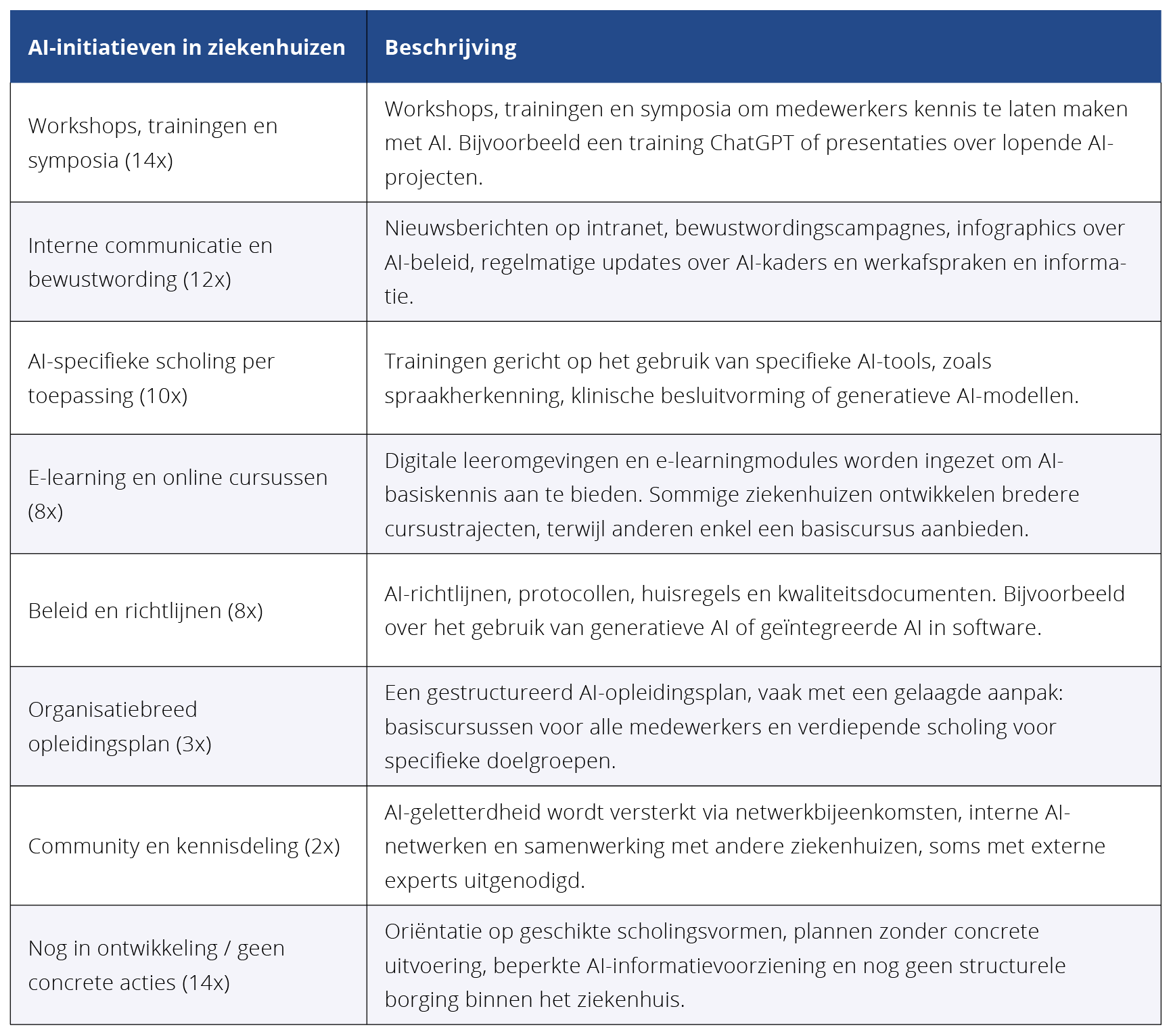 Tegelijkertijd zien we dat de initiatieven die wél worden genomen nogal uiteenlopen. Zo noemen ziekenhuizen onder meer workshops en trainingen (14 van de 46), interne communicatiecampagnes (12), AI-specifieke scholing per toepassing (10) en e-learnings of online cursussen (8). Een volledig overzicht is in de tabel op de vorige pagina te vinden.