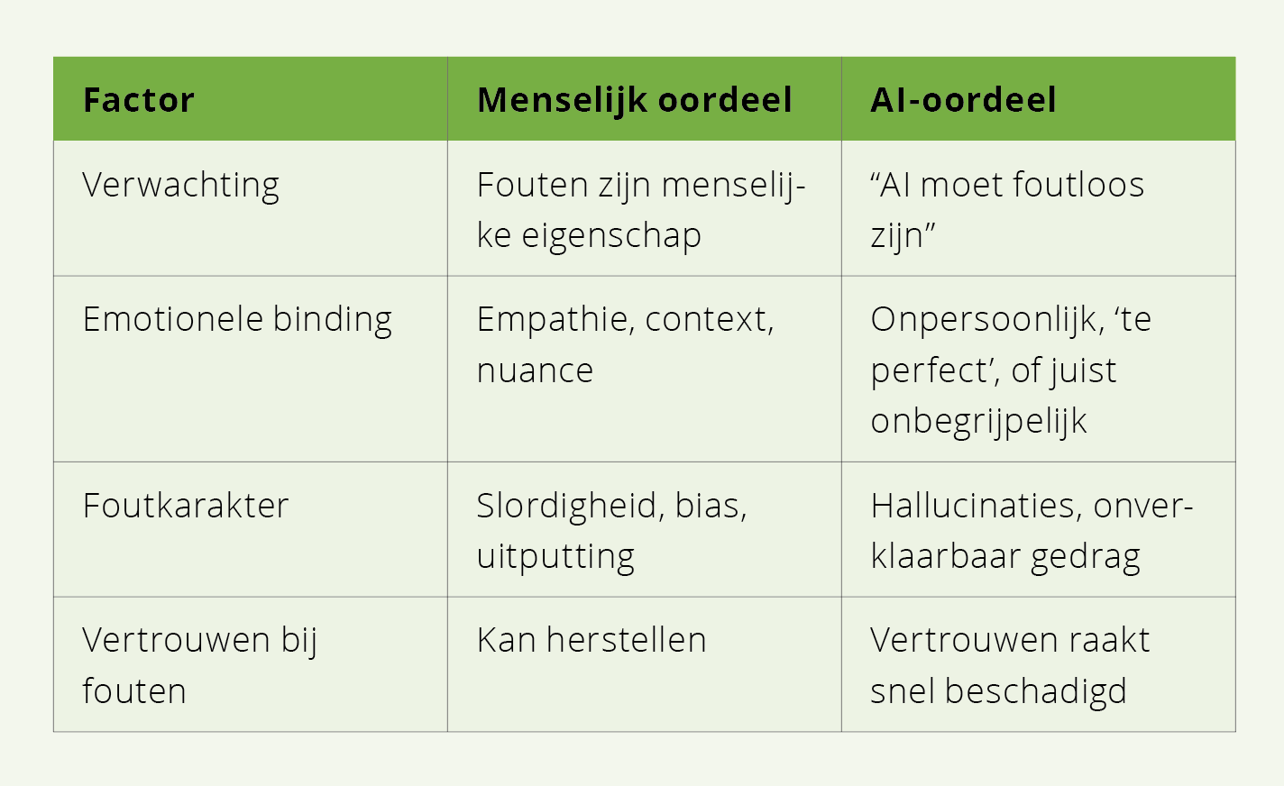 We beoordelen AI-toepassingen en helemaal LLM’s (Large Language Models) vooral vanuit gevoel. We zijn minder vergevingsgezind bij een hallucinatie dan een verkeerde uitleg van een arts. Een belangrijke reden hiervoor kan gevonden worden in de constatering dat AI-fouten vaak van een andere aard zijn dan menselijke fouten - vaak geen slordigheid, maar hallucinaties of onverklaarbare uitschieters.