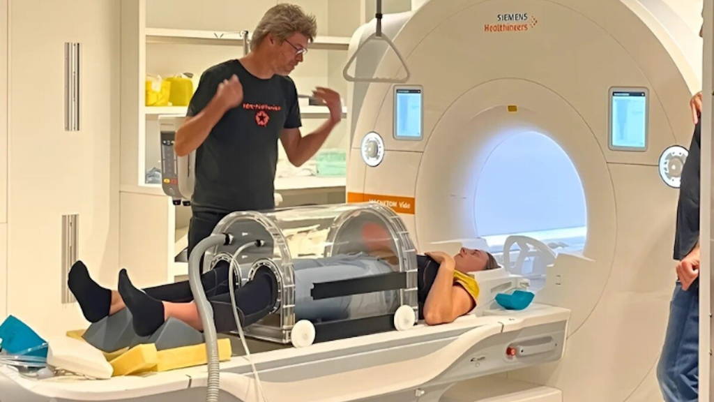 Uiteindelijk kwam hij op het idee van de MRI-box, of lower body negative pressure box. Die sluit tijdens het maken van een MRI tussen de knieën en middel af. Door vervolgens de luchtdruk in de box te verlagen, wordt het effect van snel opstaan nagebootst. Dit zorgt ervoor dat het bloed tijdelijk naar beneden ‘zakt’, wat de hersenen uitdaagt. Volgens de ontwerpers voelen de proefpersonen met die box hetzelfde lichte gevoel in het hoofd als wanneer ze snel opstaan.