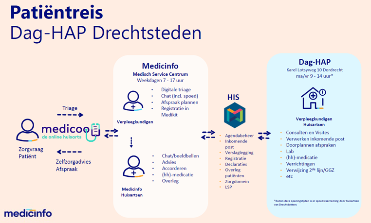 Van Kemenade voegt toe: “Nu werken we nog met een dag-HAP met gepensioneerde en waarnemende huisartsen, maar als het volume groter wordt, zou je er ook een substantiële ‘hybride praktijk’ van kunnen maken. Dan creëren we een hybride regio-oplossing. Waarbij ik meteen wil benadrukken dat die echt van en voor de regio zelf moet zijn. Als Medicinfo hebben we de rol om regio’s te helpen in het realiseren ervan. Het organiseren en leveren van hybride zorg en een medisch service centrum is namelijk echt een vak apart.”