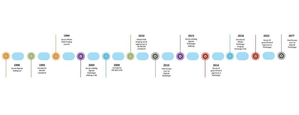 Als we terugblikken op de digitale transitie die de radiologie heeft gemaakt, zien we daar ook een gefaseerde overgang gedurende 20 jaar in Nederland. Dit begon met de introductie van het eerste PACS in 1986 met in de jaren daarna de transitie van conventionele naar digitale beeldvormingstechnieken. In de jaren ’90 werd de DICOM standaard geïntroduceerd en later is ook IHE opgericht, de organisatie die zich richt op internationale elektronische gegevensoverdracht middels standaarden.