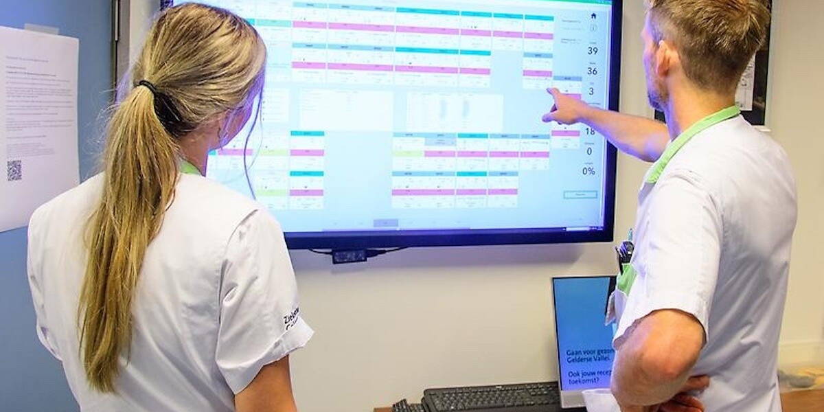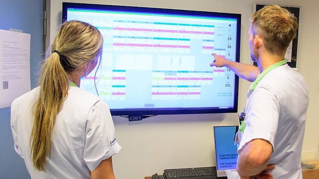 Ziekenhuis Gelderse Vallei heeft een innovatieve stap gezet in het verbeteren van de zorgprocessen door alle teamposten van de verpleegafdelingen op de 2e verdieping uit te rusten met grote touchscreen-schermen. Deze schermen bieden real-time updates over de patiënten op de afdeling, waaronder beddenoverzicht, KPI’s, zorgpaden en de werkdruk van de verpleegkundigen.