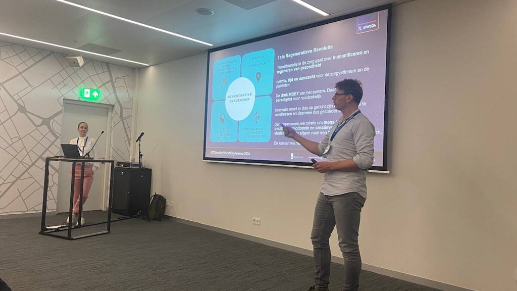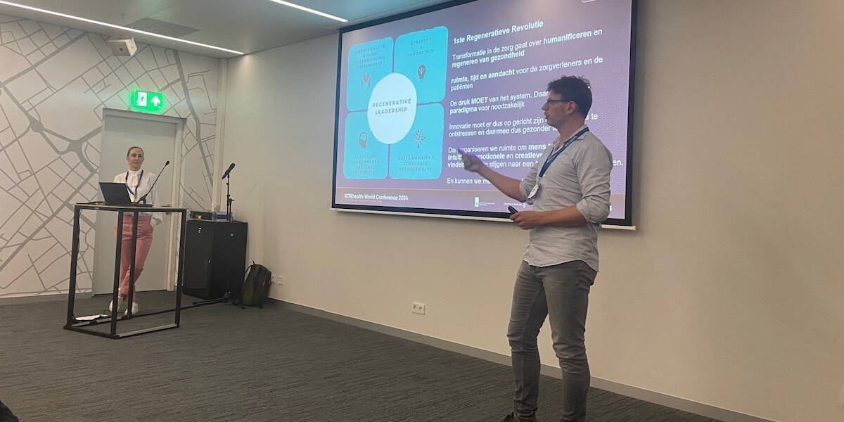 Een sleutelwoord in de presentatie van Selis en Tijssen is ‘regeneratief leiderschap’. Daarbij wordt ervan uitgegaan dat de juiste voorwaarden worden geschept om de verandering te kunnen maken zodat die verandering duurzaam is en voor de medewerkers ook gezond is. “Mens en machine moeten elkaar weten te vinden, willen we de zorg echt veranderen. Daarbij is regeneratief leiderschap belangrijk. Hierbij ligt de focus op gezondheid op alle niveaus: individueel, institutioneel, maatschappelijk en ecologisch. Door slim gebruik te maken van ondersteunende technologieën, kunnen we een humane benadering van zorg, welzijn rust en aandacht realiseren”, vinden Selis en Tijssen.